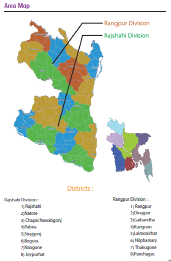 | রাজশাহী | রাজশাহী, চাঁপাইনবাবগঞ্জ, পাবনা, নাটোর, বগুড়া, নওগাঁ, জয়পুরহাট, সিরাজগঞ্জ | রাজশাহী সদর, তানোর, গোদাগাড়ী, পবা, চাঁপাইনবাবগঞ্জ সদর, গোমস্তাপুর, রহনপুর, শিবগঞ্জ, পাবনা সদর, ঈশ্বরদী, নাটোর সদর, বগুড়া সদর,শাজাহানপুর, কাহালু, শেরপুর, আদমদিঘী, শিবগঞ্জ(বগুড়া), দুপচাচিঁয়া, শান্তাহার, আক্কেলপুর, নওগাঁ সদর, জয়পুরহাট সদর, সিরাজগঞ্জ সদর |