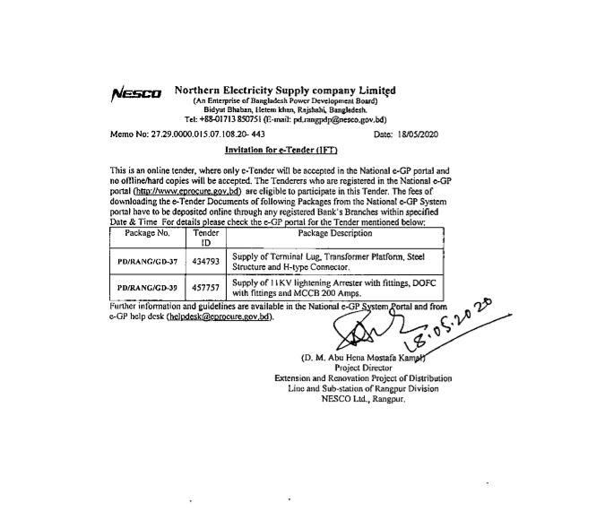 | ৪ | Procurement of Distribution Line & Equipment Maintenance (LEM) Works & Services for Sales & Distribution Division/ESU Domar & Jaldhaka of NESCO Ltd. | 459649 | ১৩/০৫/২০ | ডাউনলোড | দেখুন | ||
